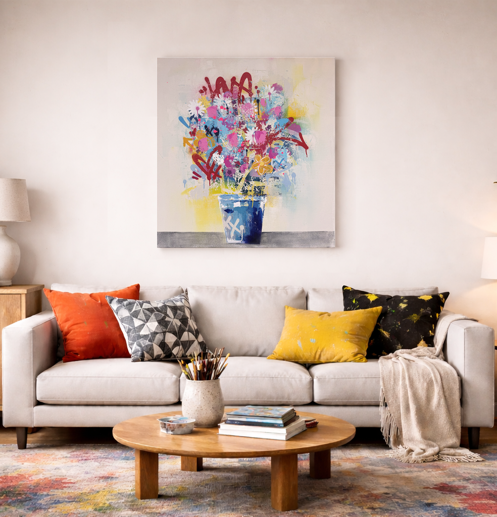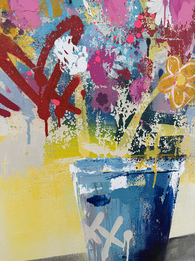 Floral forms are constructed through repetition and interruption, using negative space, saturation shifts, and textural variation to establish movement across the surface. Spray paint is used both as a drawing tool and as an atmospheric layer, softening edges and integrating hard marks into the composition.