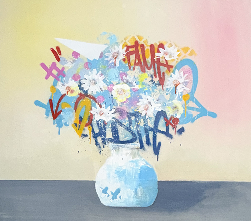 Floral forms are constructed through repetition and interruption, using negative space, saturation shifts, and textural variation to establish movement across the surface. Spray paint is used both as a drawing tool and as an atmospheric layer, softening edges and integrating hard marks into the composition.